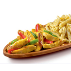 Makarna ve tavuğun harika cheddar sosuyla sunumu.